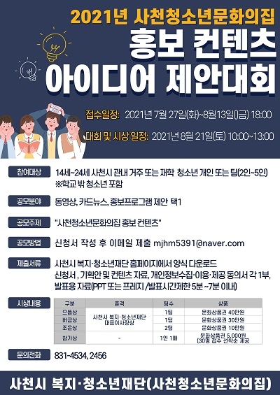 사천청소년문화의집은 청소년의 눈높이에 맞는 창의적인 홍보 컨텐츠를 발굴하기 위해 '사천청소년문화의집 홍보컨텐츠 아이디어 제안대회'를 연다고 20일 밝혔다.