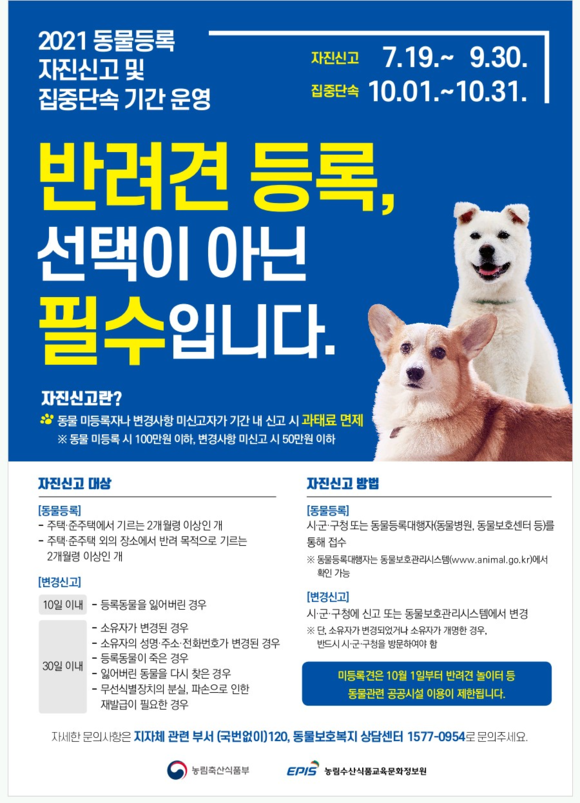 이번 자진신고 기간이 끝나면 오는 10월부터 집중단속이 실시될 예정이며, 등록대상 동물을 등록하지 않거나 등록된 정보 중 변경된 사항을 신고하지 않은 경우에는 60만원 이하의 과태료가 부과된다.