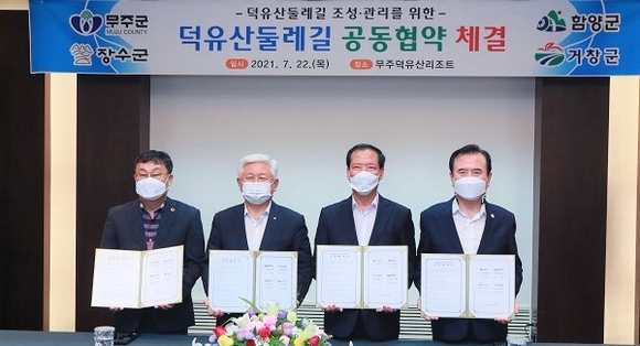 22일 전북 무주군 무주덕유산리조트에서 국립공원 10호 덕유산을 이웃한 함양군을 비롯한 4개 군 지자체장 등이 참석한 가운데 '덕유산둘레길 조성·관리 등을 위한 덕유산둘레길 업무협약식'이 열렸다.