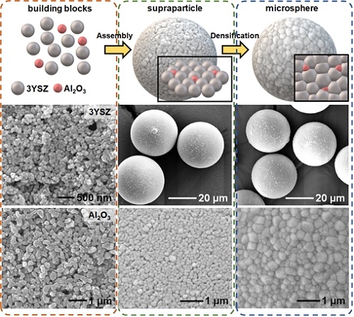 연구팀은 대량생산이 용이한 분무건조방식을 활용한 초입자 엔지니어링 기술을 바탕으로 구형도와 밀도가 높은 초소형 세라믹 조립체를 제조했다. 또한 소결 공정을 제어함으로써 경도와 탄성계수가 향상된 세라믹 마이크로입자로 변환하는 데 성공했다. 개발된 마이크로입자의 경도는 약 27기가파스칼(GPa)로 동일 조성의 여타 공정으로 개발된 소재와 비교해 가장 우수한 값을 나타냈다. 탄성계수 또한 210기가파스칼(GPa)로 뛰어난 수치를 보였다.