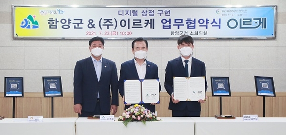군에 따르면 지난 23일 군청 소회의실에서 서춘수 군수와 황태진 군의회 의장, ㈜이르케 임준성 대표 등이 참석한 가운데 '디지털 상점 구축을 위한 업무협약식'이 열렸다.