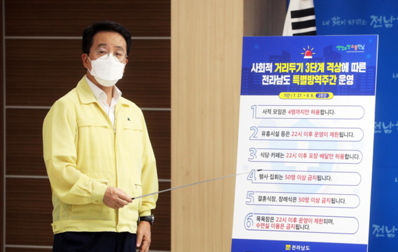전라남도는 정부의 정책에 발맞춰 27일부터 8월 8일까지 2주간 사회적 거리두기를 3단계로 격상, 사적모임 인원을 4명까지, 다중시설 영업시간을 저녁 10시까지로 제한다고 밝혔다.