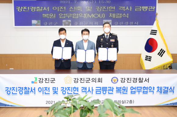 지난 23일 강진군은 군의회, 강진경찰서와 ‘강진경찰서 이전 및 강진현 객사 금릉관 복원을 위한 업무협약’을 체결했다고 밝혔다.