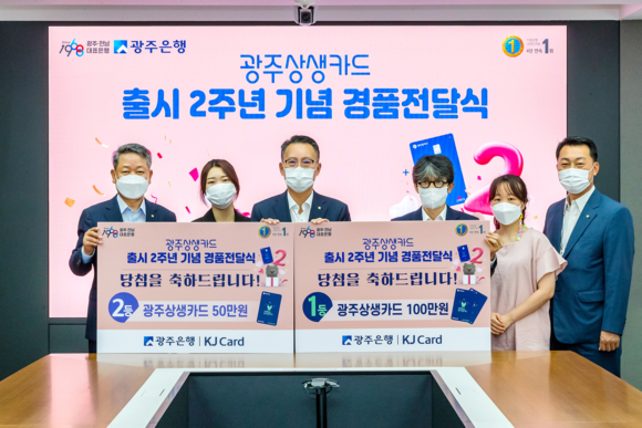 광주은행(은행장 송종욱)은 본점에서 3월 22일부터 6월 21일까지 실시한 광주상생카드 출시 2주년 기념 이벤트의 경품 당첨자를 발표하고, 1등과 2등 당첨고객을 초청해 경품 증정식을 가졌다고 밝혔다.