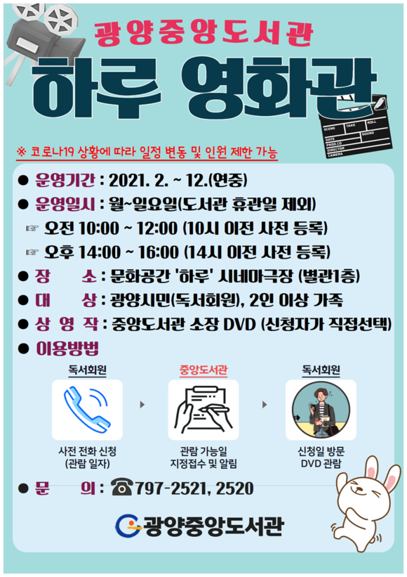 DVD 영화 관람과 대출에 관한 내용은 광양중앙도서관(061-797-2520)에 문의하면 자세히 알 수 있다.