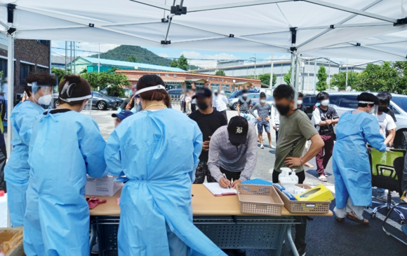 선별진료소 현장 관계자는 “외국인들의 근무, 의사소통 여건과 집단감염 위험성을 고려해 이동선별진료소 운영을 통한 선제적 전수검사를 실시하고 있다”며 “밀폐, 밀접, 밀집 환경에 노출된 감염취약사업장에 대한 촘촘한 방역 관리에 만전을 기하겠다”고 말했다.