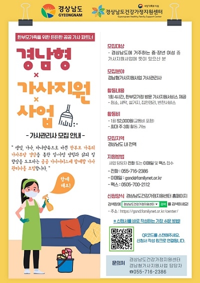 경남도는 도정 중점과제의 일환으로 저소득 가족의 안정적 생활보장과 가사부담 경감 및 일·생활 균형을 지원하고, 중장년 경력단절여성 일자리 창출을 위해 공공이 선도하는 '저소득 가사지원사업'을 추진한다고 28일 밝혔다.