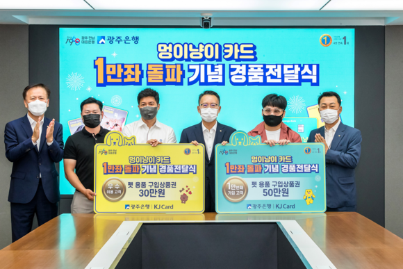 30일 광주은행에 따르면 이번 이벤트는 펫펨(Pet-Fam)족을 위해 출시한 ‘멍이냥이 신용·체크카드’의 1만좌 돌파를 기념해 이용고객에게 감사함을 전하고자 실시했으며, 1만번째 가입고객에게는 펫 용품 구입상품권 50만원, 우수 이용고객 10명에게는 펫 용품 구입상품권 30만원 등 총 350만원 상당의 경품을 제공했다.