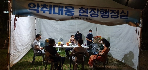 김일권 양산시장이 악취로 주거환경 불편을 호소하고 있는 북정동 주민들의 민원사항을 직접 체감하고 건의사항 등을 현장에서 청취하기 위해 악취대응 현장행정실을 열고 주민들과의 소통을 시작했다.