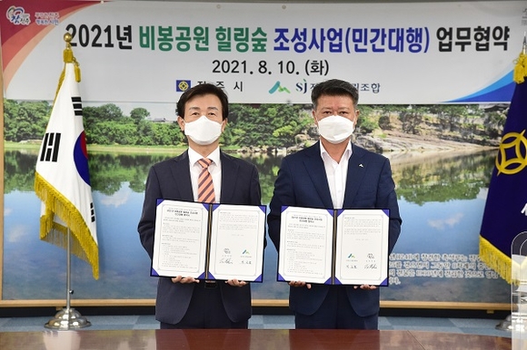경남 진주시는 10일 오전 시청 기업인의 방에서 진주시 산림조합과 비봉산 힐링숲 조성사업의 성공적 추진을 위한 업무협약식을 가졌다.
