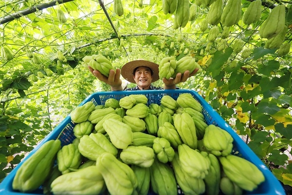 12일 경남 함양군 백전면 자연농부농장에서 박상대씨가 신소득 열대작물인 차요테를 수확하고 있다. 차요테는 비타민C, 엽산과 마그네슘 등 미네랄이 풍부하고 당뇨와 고혈압에도 효능이 있으며, 섬유질이 많아서 변비나 소화 작용에도 도움이 되는 것으로 알려져 있다. (사진=함양군 제공)