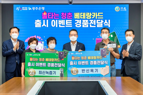 광주은행(은행장 송종욱)은 본점에서 ‘불타는 청춘 베테랑 카드’출시 기념 이벤트의 당첨 고객에 대한 경품 증정식을 가졌다고 밝혔다.