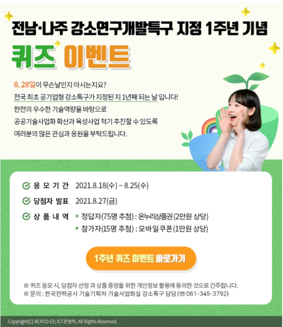 전라남도 나주시(시장 강인규)는 ‘강소연구개발특구’ 지정 1주년을 기념해 한국전력공사와 퀴즈 이벤트를 진행한다고 13일 밝혔다.