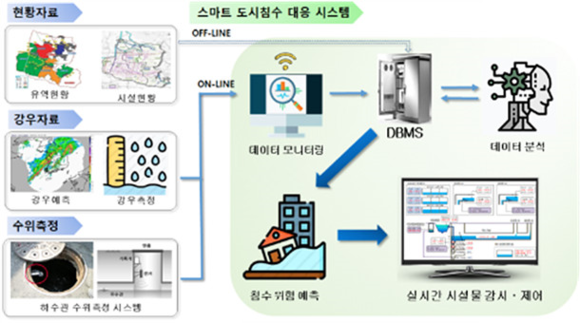 도시침수 대응사업은 지역별 강우량을 예상 분석하고 ICT 기반 수위 측정시스템을 통해 하수관로의 수위를 실시간 확인하는 사업으로, 도시침수를 사전에 예측해 강우 시 하수 월류로 인한 도시침수 피해를 예방하는 효과가 기대된다.