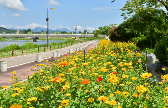 먼저, 문화대교 인근이 주목된다. 노란색과 분홍색, 빨간색 백일홍을 교차로 심어 화사하면서도 산뜻한 느낌의 꽃밭을 연출했다.