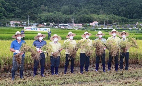 이날 관내 첫 벼 베기 행사에는 서춘수 함양군수를 비롯한 기관단체장, 농업인 등 20여명이 참석해 벼 첫 수확을 축하했다.