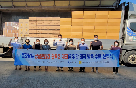 25일 완도군에 따르면 선적식에는 군 관계자를 비롯, 전라남도 중소기업진흥원, 완도군 수출 기업 대표자들이 참석했으며, 냉동 전복과 전복 차우더(수프), 다시마 국수, 유자청, 곱창김, 미역 등 약 7천만 원 가량의 완도 수산 식품이 태국 방콕으로 보내졌다.