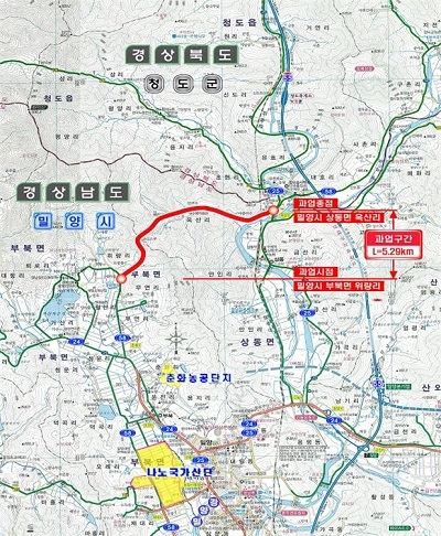 이번 예비타당성 조사를 통과한 '부북~상동 국도 건설사업'은 부북면 위양리와 상동면 옥산리를 연결하는 미개설 국도58호선 5.29km를 국비 719억원을 투자해 2차로로 신설하는 사업이다.