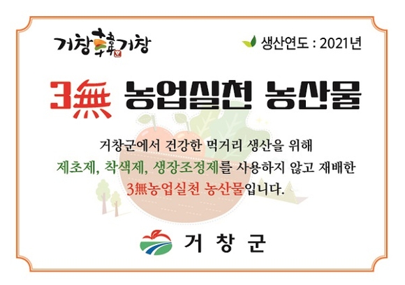 군은 지난 7월 3無농업 실천 농산물 브랜드 개발 용역을 완료해 생산물에 대한 홍보용 스티커를 제작·배부했으며, 생산물은 3無 농산물 인증 스티커를 부착하고 전국으로 판매될 예정이다.