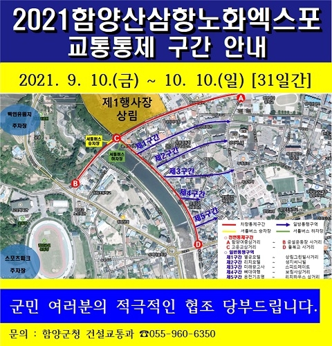 경남 함양군은 '2021 함양산삼항노화엑스포' 기간 원활한 엑스포 진행을 위해 상림공원 제1행사장 주변 도로에 대한 전면통제와 이면도로 일방통행을 실시하기로 했다.