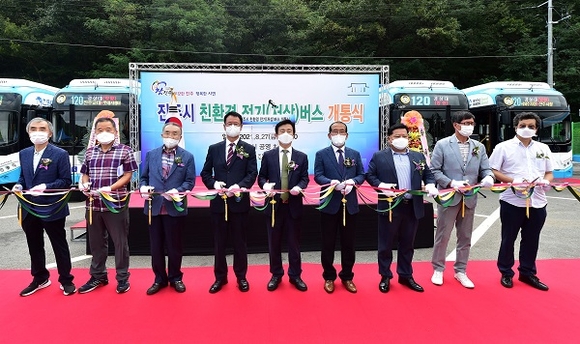 진주시는 27일 오전 내동면 소재 진주시 시내버스 공영차고지에서 친환경 전기저상버스 도입 기념 행사를 열고 진주시 최초의 전기 저상 시내버스 12대를 운행한다고 밝혔다.