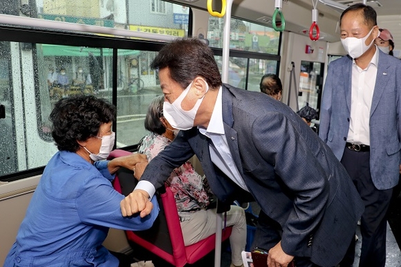 이날 문준희 군수는 순환버스에 탑승해 어르신들의 짐을 들어드리며 현장에서 주민과의 대화를 이어갔고 버스 이용에 불편함은 없는지 등 개선 사항을 점검했다.