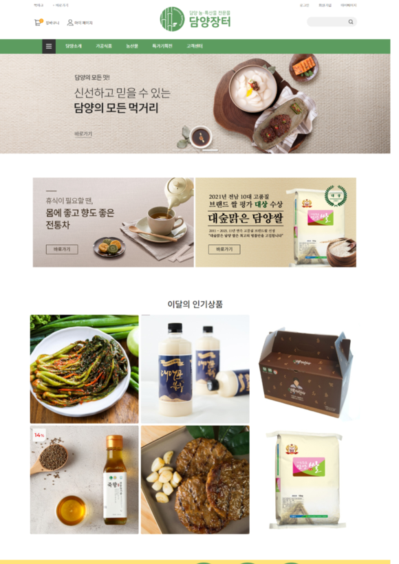 ‘담양장터’는 지역에서 생산되는 365여 가지의 가공식품을 판매하고 있으며, 전남 10대 고품질 브랜드 쌀 대상을 수상한 대숲맑은 담양쌀과 전통한과, 주류, 장류를 비롯해 다양한 소비층을 겨냥한 치즈돈가스, 쌀파스타, 요거트, 오란다, 건강보조식품 등 담양에서 생산되는 식품을 한자리에서 만나볼 수 있다.