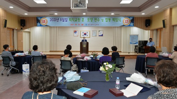 광주시교육청이 30일 오전 10시 대회의실에서 ‘2021년도 8월말 퇴직교원 훈·포장 전수 및 합동 퇴임식’을 개최했다.