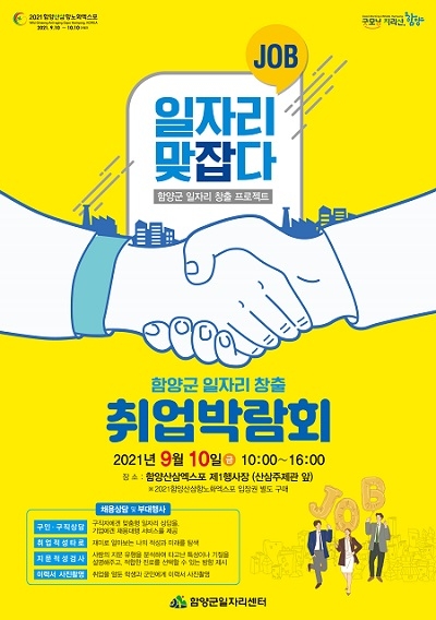 경남 함양군이 지역민들에게 폭넓은 취업기회를 제공하고 기업에게는 우수 인재 채용기회를 확대하기 위한 '2021년 함양군 일자리 맞JOB다' 취업박람회를 오는 10일 개최한다.