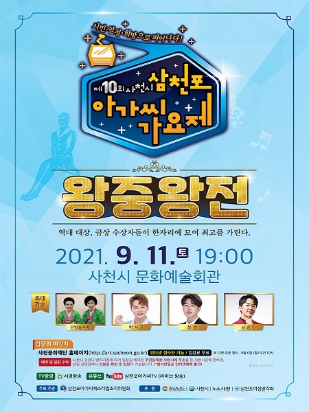 가요제 왕중왕전은 유튜브 삼천포아가씨TV로 실시간 중계되는데, 현장 투표와 유튜브 시청자들의 100% 인기투표로 사천지역 최고의 가왕을 뽑게 된다. 서경방송에서는 녹화 중계를 할 예정이다.