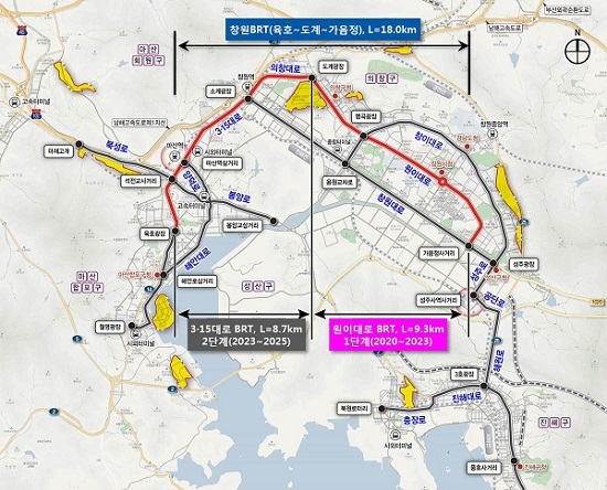 창원 S-BRT는 지난해 12월 경상남도로부터 가음정사거리~육호광장, 총 18km 구간에 대해 개발계획을 승인받았다.