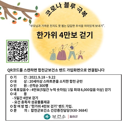참여 대상은 20세 이상 스마트폰을 소지한 군민이며, 참여 방법은 군청 홈페이지 안내문에 있는 QR코드 스캔 또는 밴드에서 '한가위 4만보 걷기'를 검색해 합천군 보건소 밴드로 가입하면 된다.