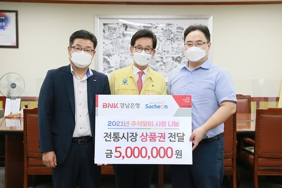 BNK경남은행 삼천포지점은 지난 8일 사천시청을 방문해 추석 명절을 앞두고 관내 어려운 이웃을 위한 온누리상품권 500만 원을 기탁했다.