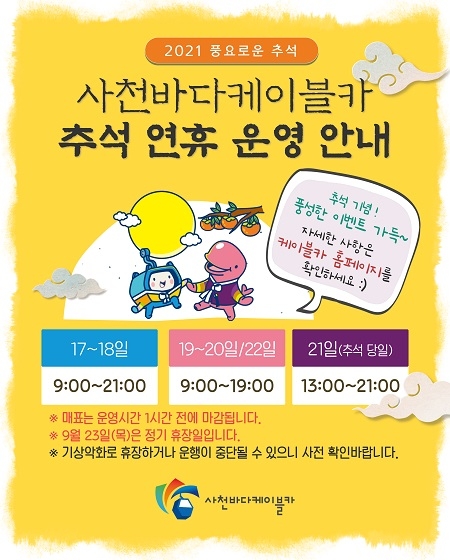 민족의 대명절인 한가위를 맞아 경남 사천바다케이블카는 추석 연휴 기간에도 모두 정상 영업한다.