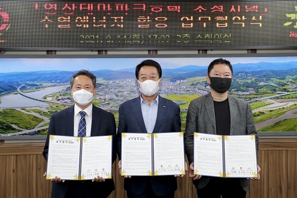 경남 합천군은 지난 14일 군청에서 한국수자원공사, ㈜BXNK와 영상테마파크 호텔 조정지댐 수열에너지 활용을 위한 업무협약을 체결했다.