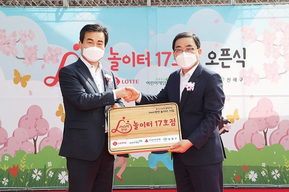 허성무 시장은 임성복 롯데지주 전무에게 감사의 마음을 담은 감사패를 전달했다. 임성복 롯데지주 전무는 허성무 창원시장에서 맘편한 놀이터 17호점 현판을 전달했다.