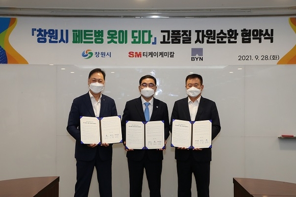 경남 창원시는 28일 ㈜비와이엔블랙야크, ㈜티케이케미칼과 '투명페트병을 모아 의류로 재생산하는 자원순환체계' 구축을 위해 업무협약을 체결했다.