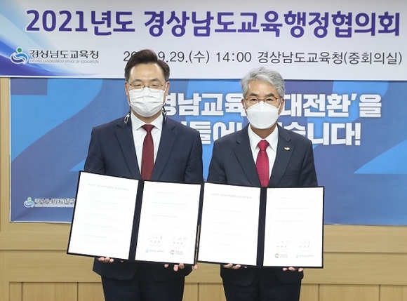 경남도교육청과 경남도는 29일 도교육청 중회의실에서 '2021년 경상남도 교육행정협의회 정기회의'를 열고 미래 교육환경에 선제적으로 대응하기 위해 공동 노력하기로 합의했다.