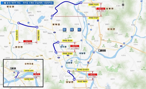 이번에 반영된 제5차 국도·국지도 건설 5개년 건설사업이 내년부터 본격적으로 착수되면 현재 건설 중인 함양-울산간 고속도로 및 무안-내이간 지방도와 연계해 밀양시 간선도로망의 축을 완성할 것으로 기대된다.