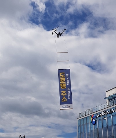 이보다 앞선 지난 8월에는 사천케이블카 자연휴양림 개장식 행사장에서 드론에 도로명주소 홍보 및 코로나19 ‘잠시멈춤’ 플래카드를 매달아 상공을 비행시키면서 참석자들로부터 많은 관심을 받기도 했다.