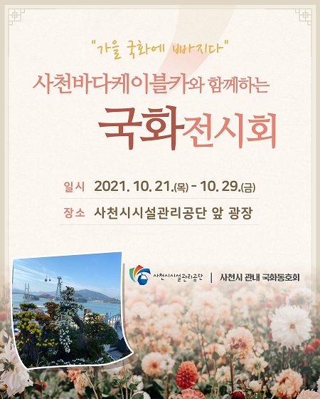 올해로 2회째를 맞는 이번 국화전시회는 '가을 국화에 빠지다'라는 주제로 사천시 관내 자율모임인 국화동호회에서 정성껏 길러낸 국화꽃, 분재국화 등 110여 점의 작품이 전시될 예정이다.