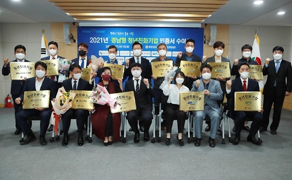 경남도와 경남경제진흥원은 27일 오전 도정회의실에서 '2021년 경남형 청년친화기업'으로 선정된 13개 기업에 인증서를 수여했다.
