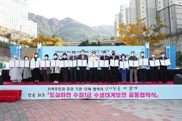 경남 창원시는 29일 오전 도심하천 중 수질상태가 매우 양호한 신이천의 냉천근린공원에서 지역주민, 종교계, 환경단체, 교육계 등 16개 단체와 함께 전국 최초의 도심하천 수질1급 수생태계보전 협약행사를 가졌다.
