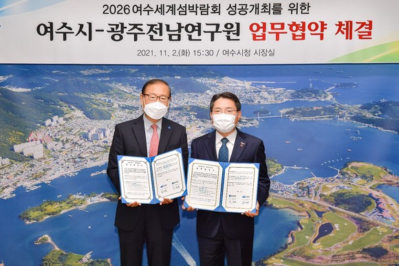 여수시에 따르면 권오봉 여수시장과 박재영 광주전남연구원장은 2일 시장실에서 2026여수세계섬박람회 성공개최를 위한 업무협약식을 가졌다.