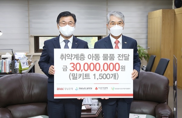 BNK경남은행이 8일 경남도교육청에 3천만원 상당의 취약계층 아동 물품을 기탁했다.