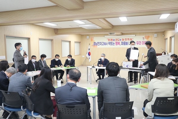 이어 '경남전자고에서 싹트는 행복, 마음을 나누는 우리 이야기'라는 소주제로 교직원과의 대화 시간도 가졌다. 학생들의 입학부터 졸업까지, 그리고 사회 진출 이후 성장 과정과의 연계를 꿈꾸는 교육회복 관련 소통에는 학생을 위한 교직원의 마음이 가득 담겨있었다. 박종훈 교육감은 코로나19 상황 속에서도 학생들의 배움과 성장이 끊어지지 않도록 애쓴 교직원들의 노력과 고민에 감사를 표하며 교육청도 함께 걸어갈 것을 약속했다.