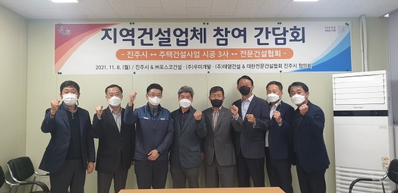 경남 진주시는 지난 8일 관내 공동주택 시공 3사(포스코건설, 우미개발, 태영건설) 및 대한전문건설협회 진주시 협의회 임원진과 지역경제 활성화를 위한 간담회를 가졌다.
