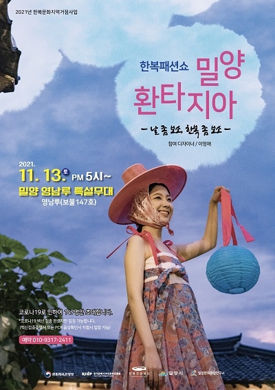 경남 밀양시는 아름다운 한복과 지역의 전통문화 자원 연계를 위한 한복 패션쇼(주제: 밀양 환타지아 '날 좀 보소, 한복 좀 보소')를 우리나라 대표 누각인 영남루(보물 제147호)에서 연다고 10일 밝혔다.