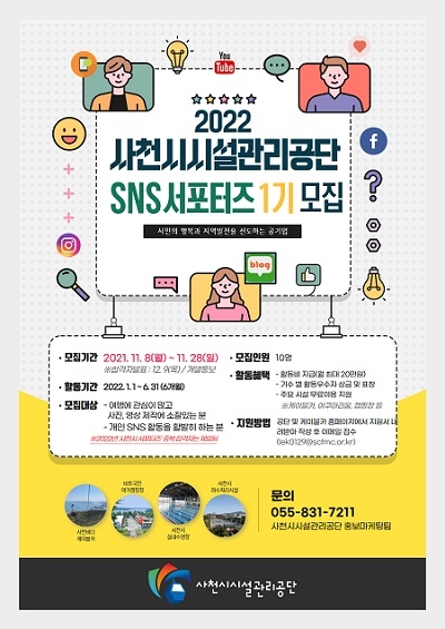 사천시시설관리공단은 공단을 전국에 알리고 고객과의 소통을 확대하기 위해 '2022년 사천시시설관리공단 SNS 서포터즈' 1기를 모집한다고 10일 밝혔다.
