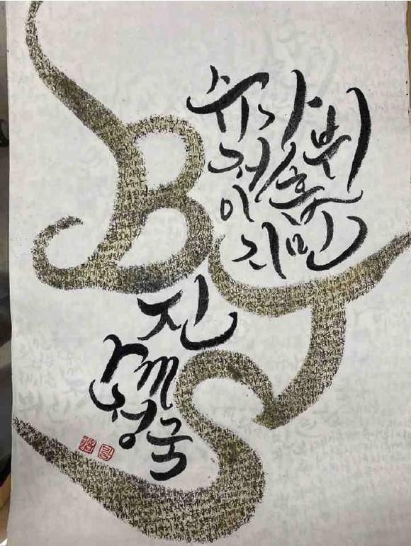 대상작 ‘화합’은 멤버들 개인의 개성과 능력이 합쳐져 BTS라는 그룹으로 더 큰 시너지를 내는 것을 우리나라의 전통 한지와 먹 글씨의 강약으로 표현했다.